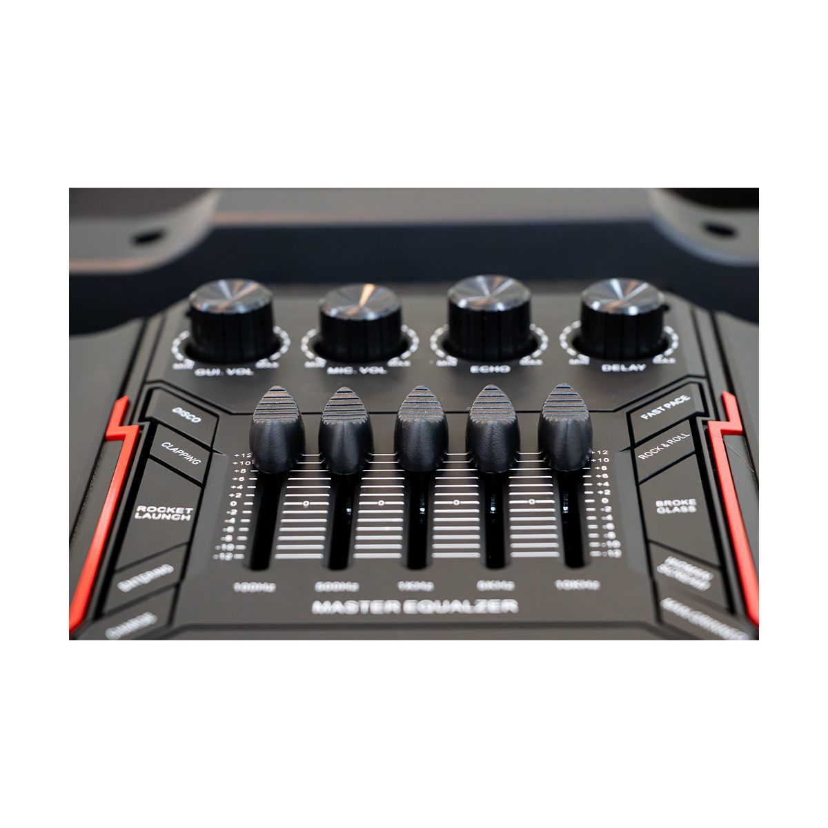 اتصال آلات موسیقی، بدنه مقاوم با ضخامت 16 میلیمتر، تنظیم BASS و اکو مخصوص میکروفون، اکولایزر قابل تنظیم، تنظیم صدای خواننده و میکروفون، جایگاه مخصوص میکروفون در پشت دستگاه، ولومهای چرخشی مجزا برای تنظیم صدای موسیقی و افکتها، افکتهای صدا با 6 نمونه پیشساخته، میکروفون داخلی، دیجی پنل انحصاری، رقص نور حرفهای با لیزر داخل و خارج از ووفر، قابلیت اتصال به اپلیکیشن تلفن همراه هوشمند به منظور تنظیم نور و صدا با موبایل یا تبلت، قابلیت قطع و وصل رقص نور، نمایشگر بزرگ، هر واحد با 200 وات واقعی و ووفر چراغدار با قدرت صدای فوقالعاده است.